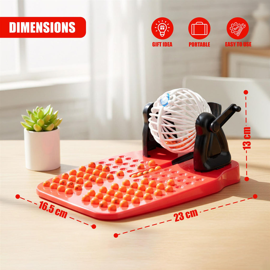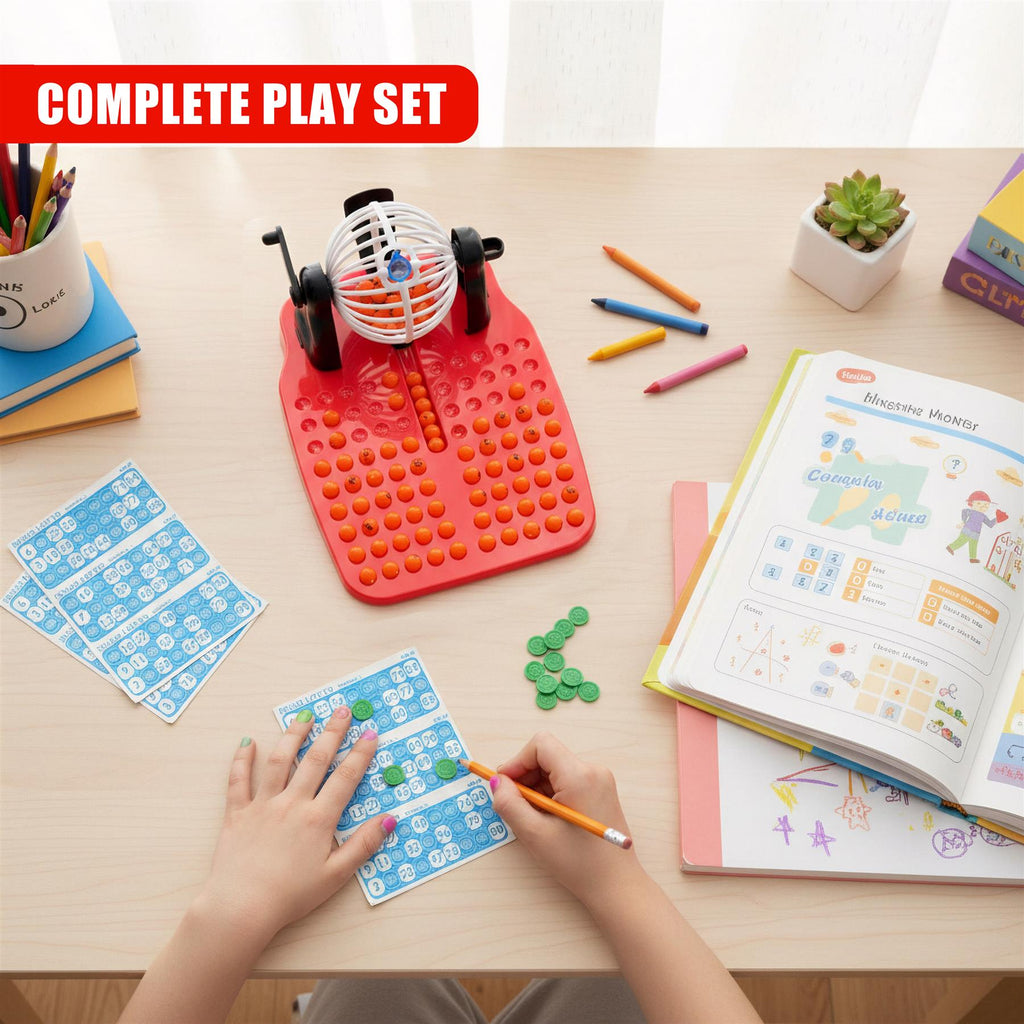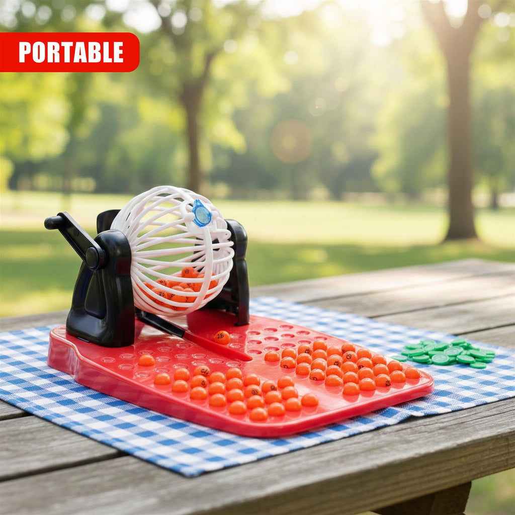 Includes a bingo machine cage, 90 balls, 24 cards, and counters. No batteries needed—simply turn the handle to auto-select numbers for endless lotto or tombola fun.