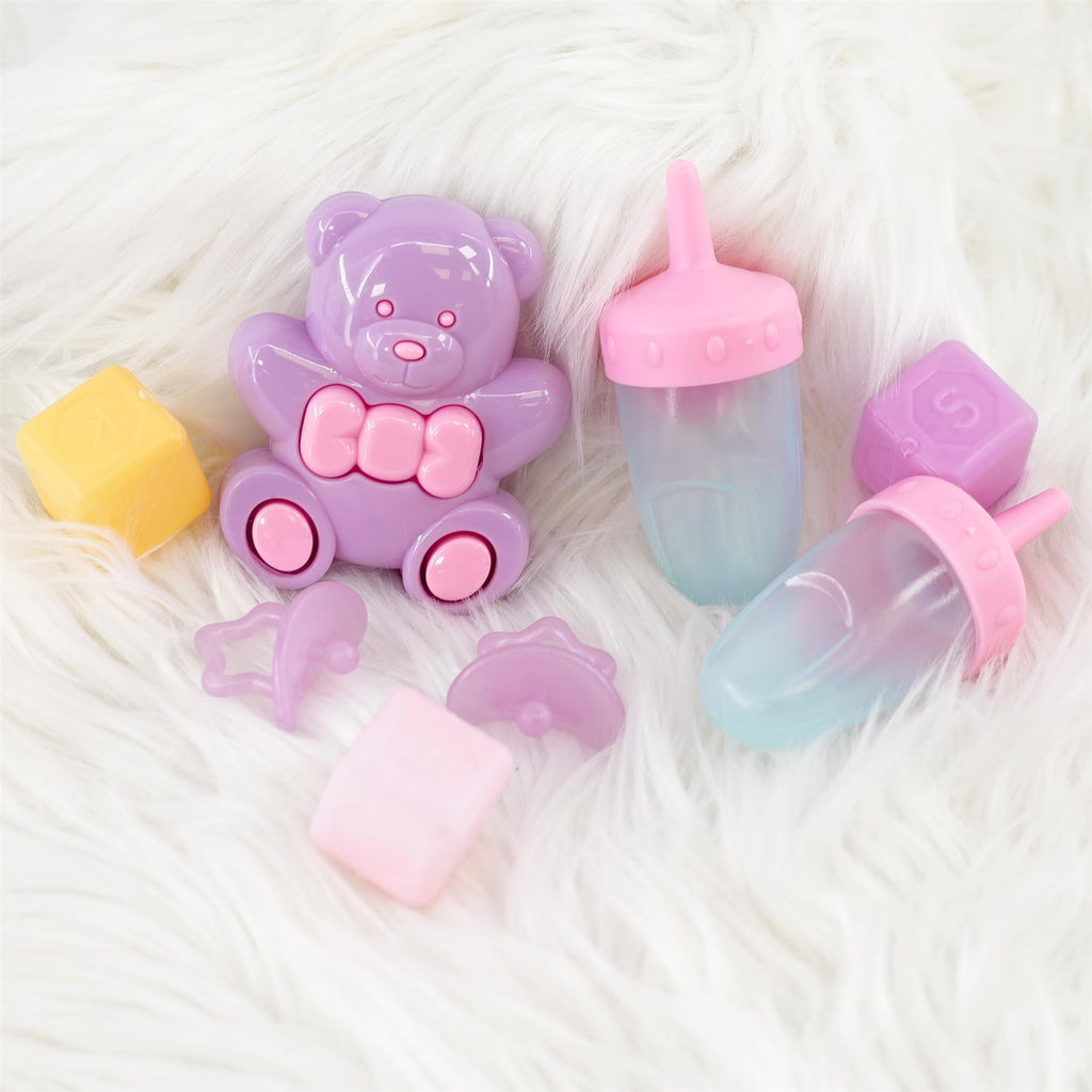 Our twin dolls come with a set of must-have accessories that will enhance your child's playtime. Each twin has their very own dummy and feeding bottle, adding to the caregiving experience. The stacking cubes and rattling bear toy provide extra entertainment, stimulating creativity and fine motor skills. The dolls are dressed in charming pink and blue outfits that are not only adorable but also easy to change, allowing your child to have endless fun mixing and matching styles.