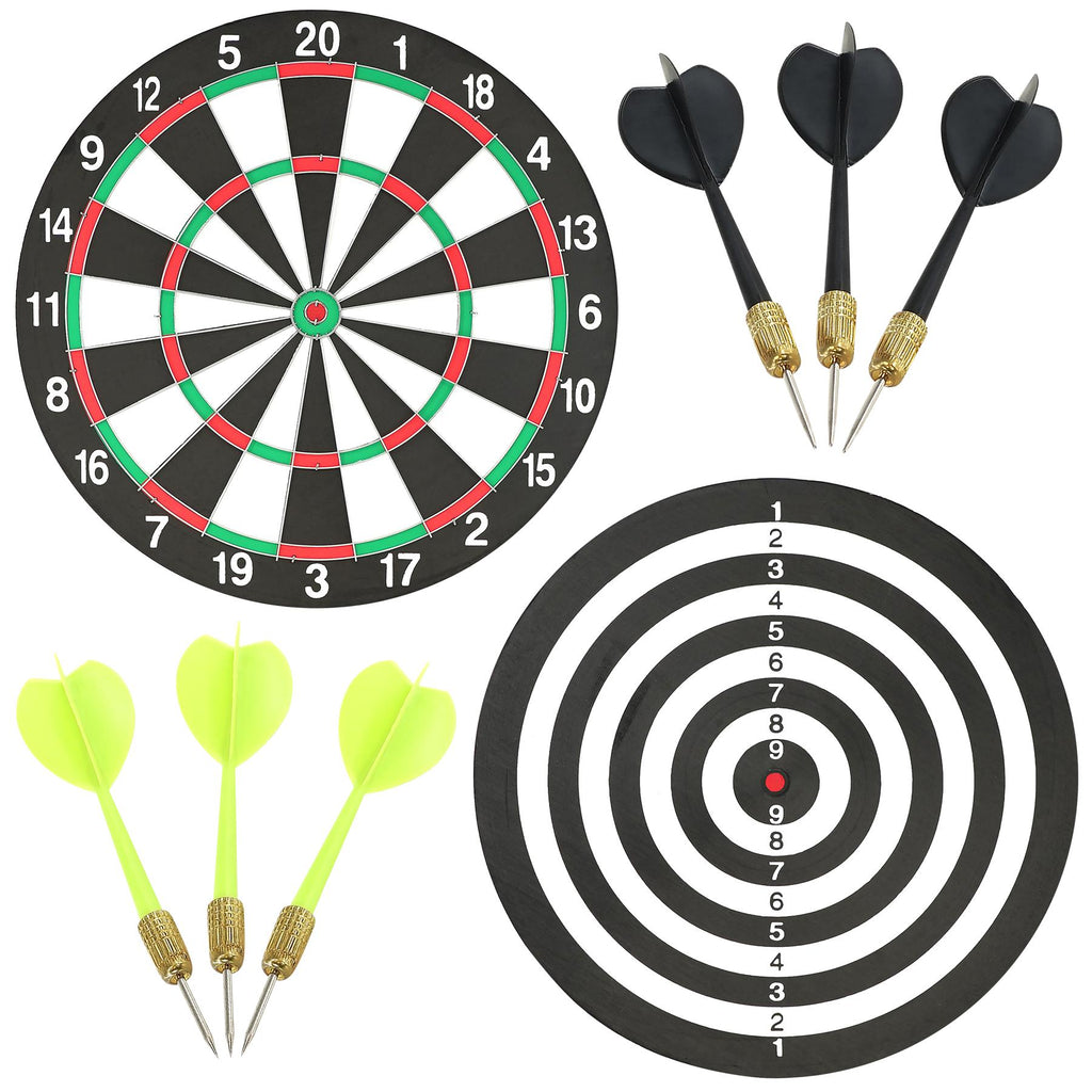 Enjoy hours of family fun with The Magic Toy Shop Dartboard Set. This 17 inch, double-sided board features classic 20-point darts on one side and a target bull's-eye game on the other. It is a complete darts set, including 6 metal-tipped darts. The high-visibility printed numbers make this a great kids dart board set. Whether for a friendly game or a serious competition, this board is perfect for beginners and pros and is a classic choice for all fans of darts & dartboards.