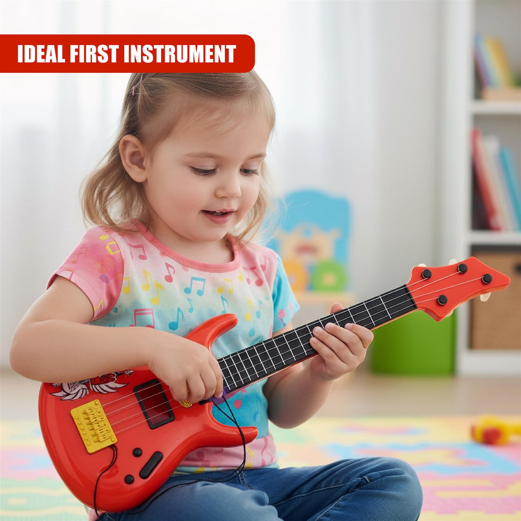 The toy guitar helps prevent frustration kids might feel when attempting to play on a full-size instrument. This plastic guitar helps young children to discover the fun of playing music. Kids learn how to correctly hold the guitar, where to put their hands and how to strum the strings.
