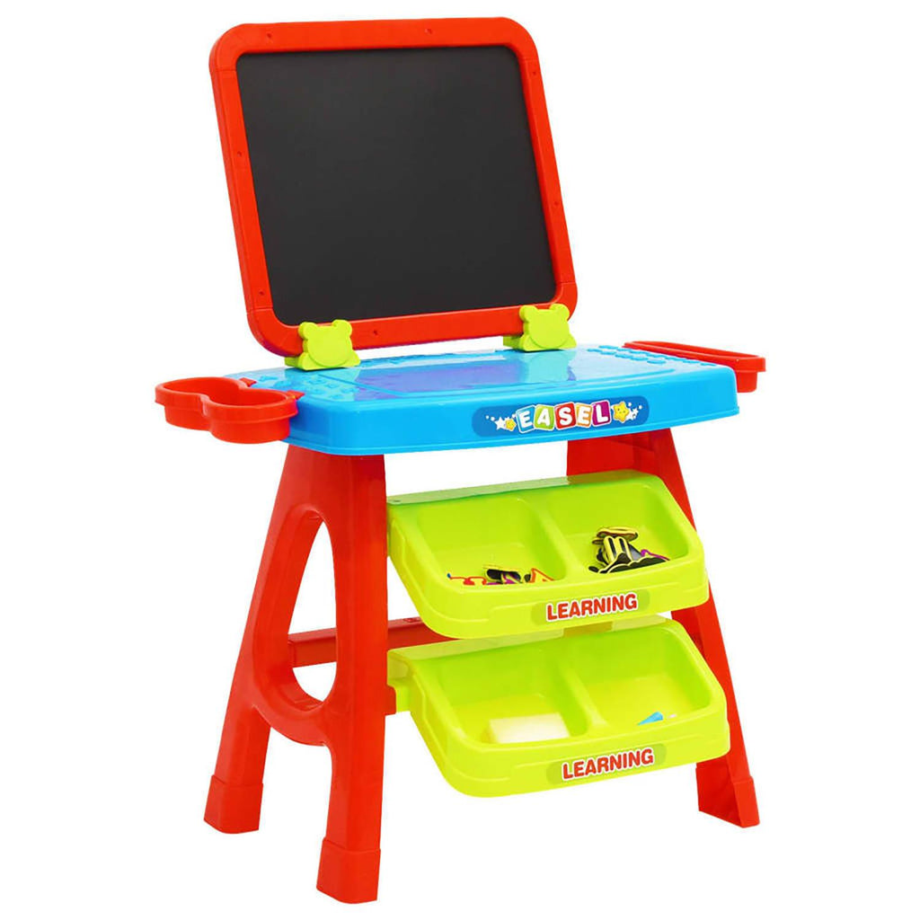 Unlock creativity with our 2 in 1 Learning Desk and Easel. This versatile station features a double-sided board with a magnetic whiteboard and a chalkboard. It comes equipped with magnetic letters, numbers, chalk, and markers to encourage early learning. With built-in storage trays for easy cleanup, this standing easel is the perfect educational center for drawing, writing, and playing.