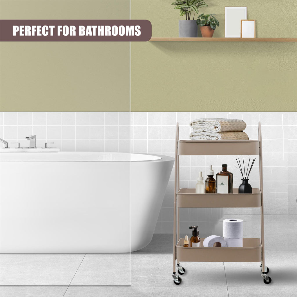 This 3 tier trolley on wheels is a durable metal organiser with mesh baskets and smooth-rolling casters, perfect for kitchen storage & organisation, bathroom storage on wheels, or craft and beauty supplies.