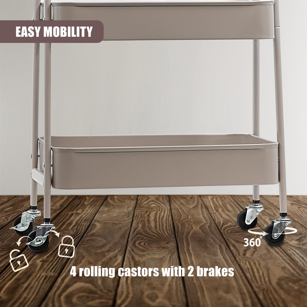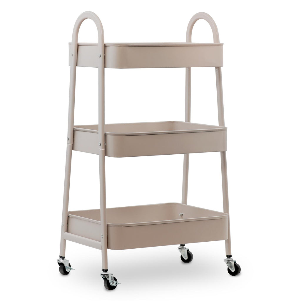 Strong metal trolley on wheels with rust-resistant finish. Smooth-rolling casters, 2 lockable for stability, make this organiser trolley practical for both heavy and light everyday storage.