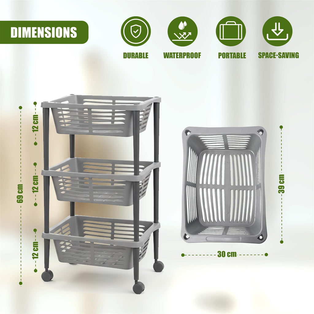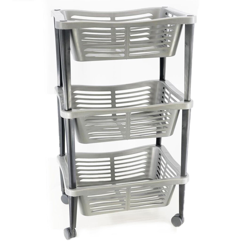 - Dimensions: Length is approximately 27 cm, Width is approximately 39 cm, Height of each shelf is approximately 12 cm, The gap between each shelf is approximately 15 cm, After assembling the trolley is approximately 69 cm|Comes in two assorted Grey colours.