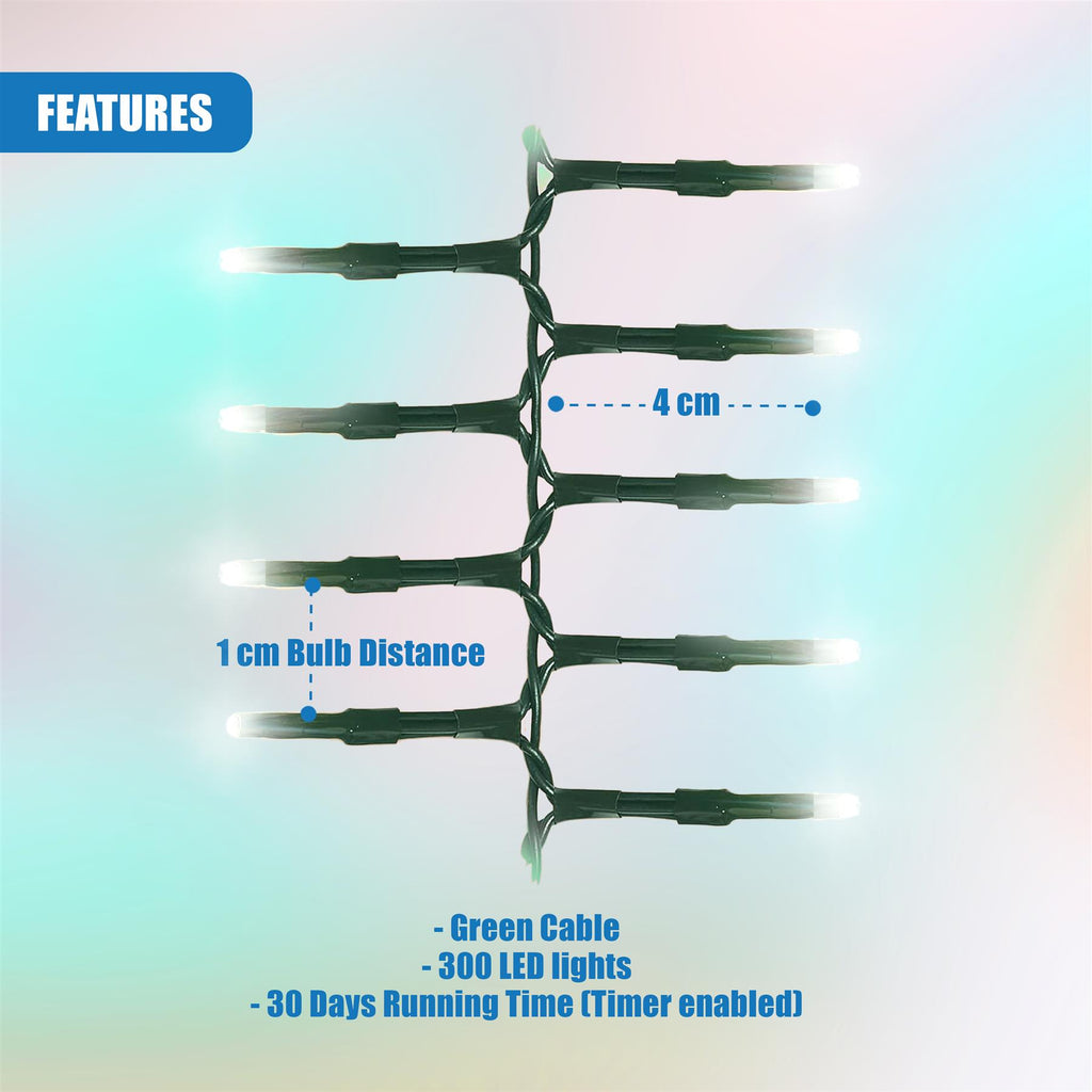 - SPECIFICATIONS: Item Dimensions: Width: 22 cm, Depth: 2.5 cm, Height: 32 cm, Length: 350 cm / Weight: 320 g / Package Dimensions: Height: 32 cm, Width: 22 cm, Depth: 2.5 cm / Package Weight: 340 g / Material: PVC / Light Color: Cool White / Battery Required: 4x 1.5V AA (Battery included) / Green Cable / 3m Lit length / 6 On & 18 Off timer / 8 Different functions / Indoor & Outdoor