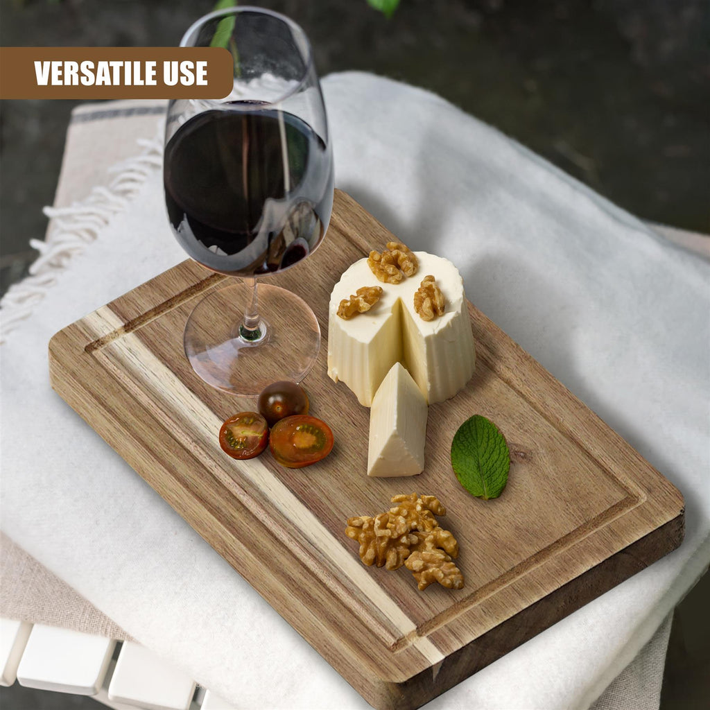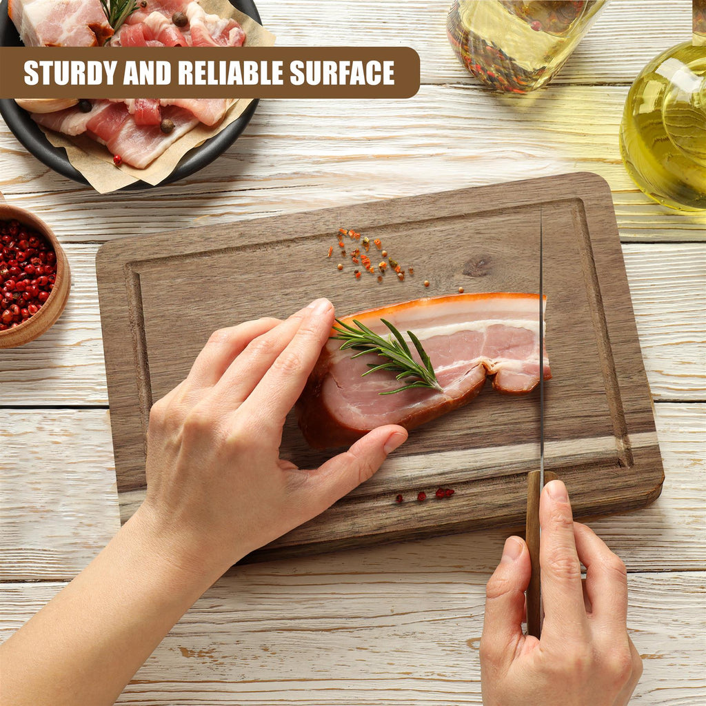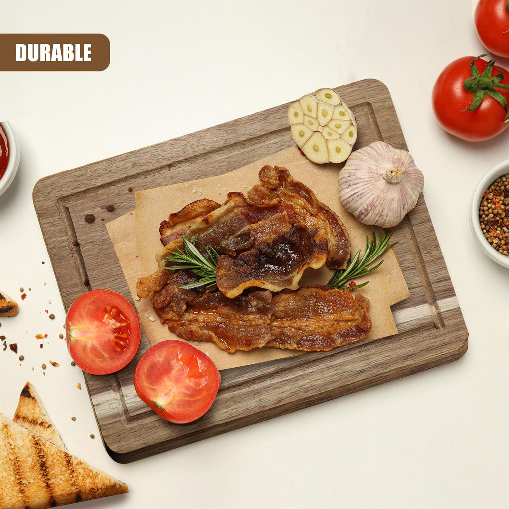 Features acacia chopping board with groove along edges to catch juices. Smooth reverse side for versatile use. Ideal wooden cutting board for all slicing, chopping, and cutting tasks.
