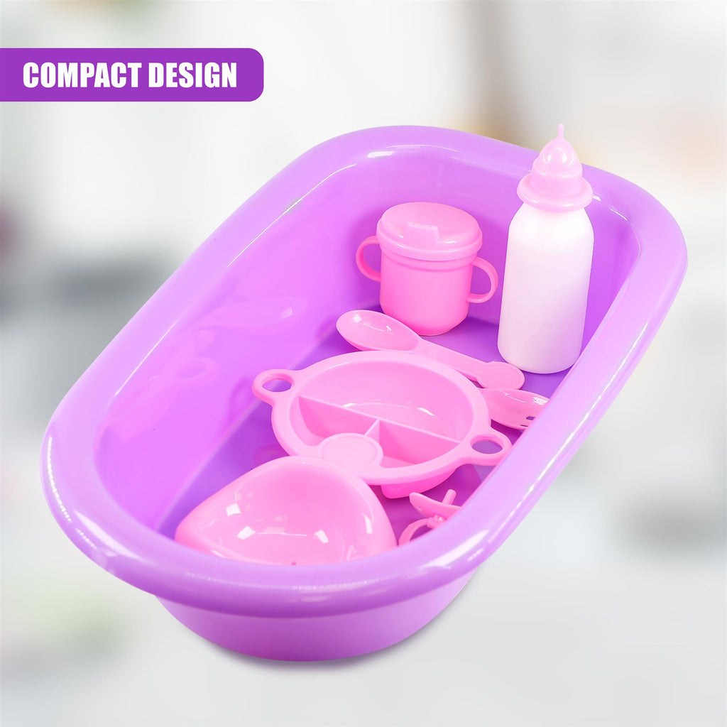 This set includes 8 pieces: Bath, Potty, Milk bottle, Sippy cup, Dummy, Spoon, Fork, and Plate. Allows your child to use their imagination through this great children's role-play set that will keep them entertained for hours.