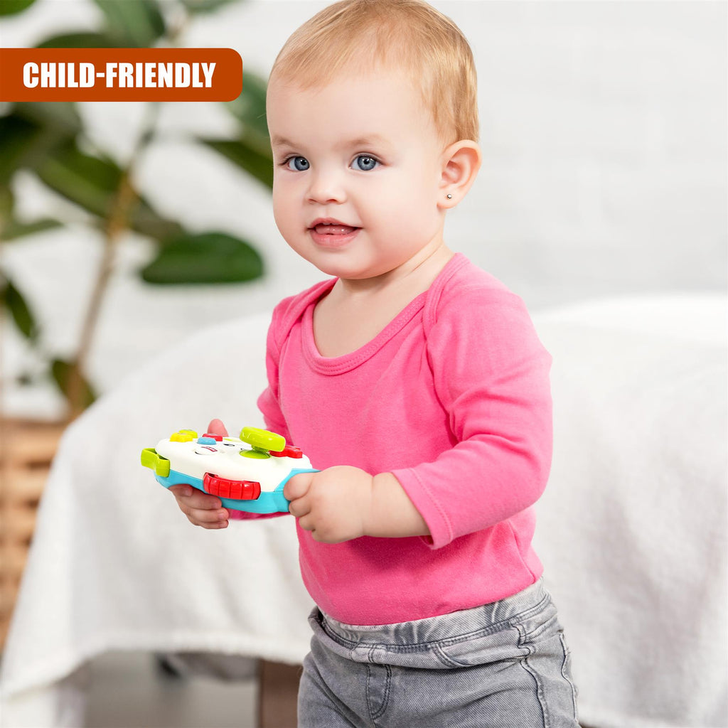 The baby game controller toy has buttons, analogue stick and D-pad. Lights and sounds activate with every press, making it a fun toy controller that encourages pretend play.