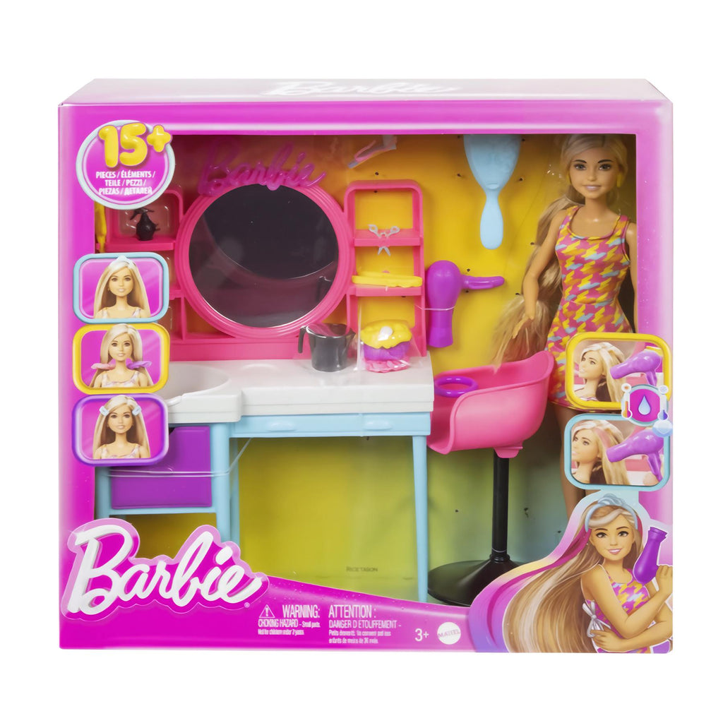 Unleash your inner stylist with this comprehensive vanity playset featuring a Barbie doll with extra-long color-change hair and over 15 storytelling accessories.