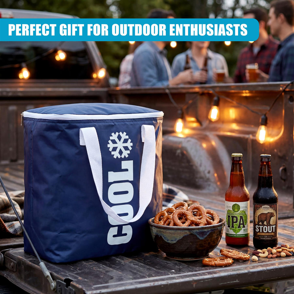 Upgrade your outdoor dining experience with this highly practical 24 litre cool bag. Designed with a premium aluminium lining and foam core, it provides exceptional thermal insulation to keep food and drinks chilled. The collapsible dark blue structure features a wide opening with a double puller zipper for incredibly easy access. Finished with strong webbing handles, it ensures comfortable carrying even when fully loaded. It is the perfect insulated food bag for picnics and camping.