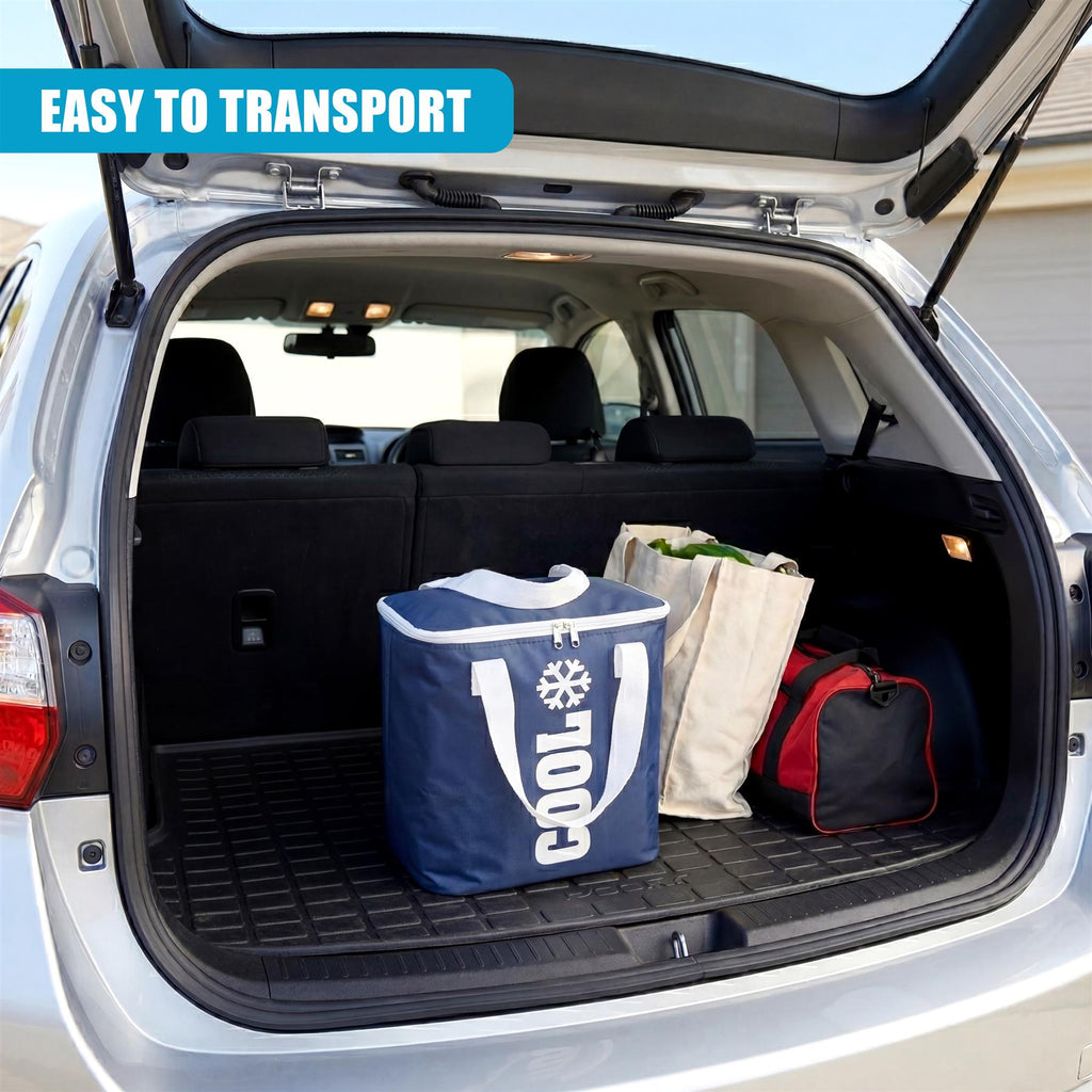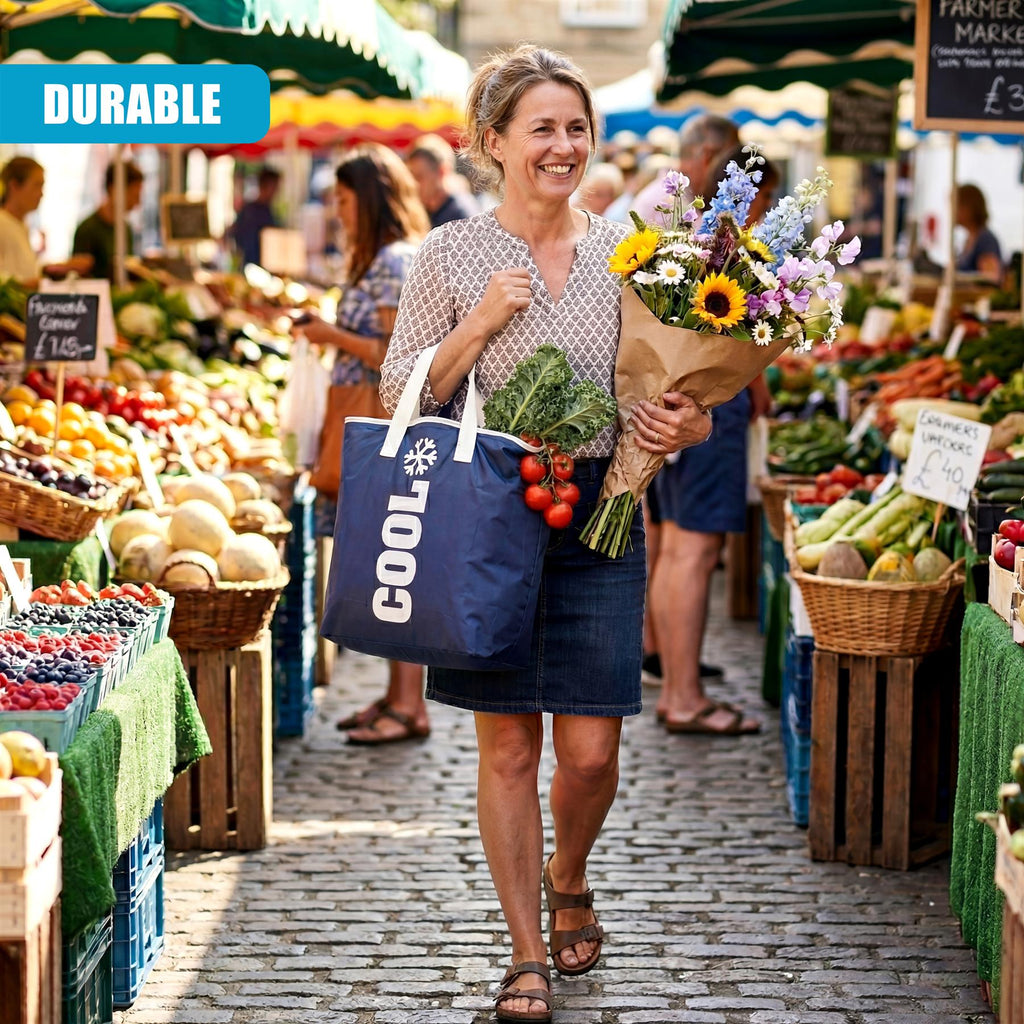 Complete with strong webbing handles to make carrying heavy items effortless. This dark blue thermal bag is an essential accessory for beach days and grocery shopping.
