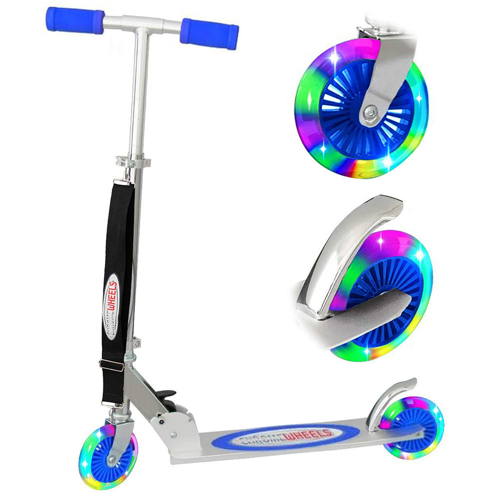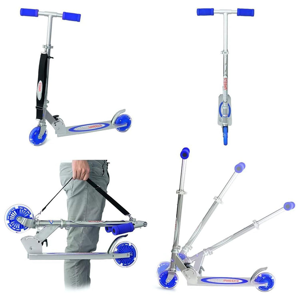 Perfect for travel and storage. This light up scooter folds flat in three simple steps. It includes detachable non-slip handles and an adjustable shoulder strap for effortless transport.