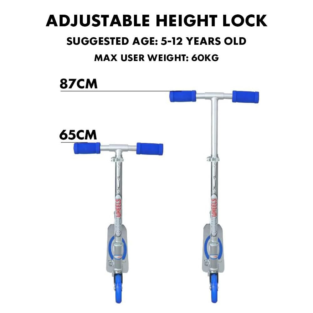 - SPECIFICATIONS: Item Dimensions: Width: 70 cm, Depth: 10 cm, Height: 65 cm / Weight: 2900 g / Package Dimensions: Height: 67 cm, Width: 22 cm, Depth: 11 cm / Package Weight: 2910 g / Material: Aluminum / Color: Blue / Recommended Age: 5 years and over / Maximum User Weight: 60kg / Adjustable User Height: Age 5 to 12 (Handlebar 65cm to 87cm)
