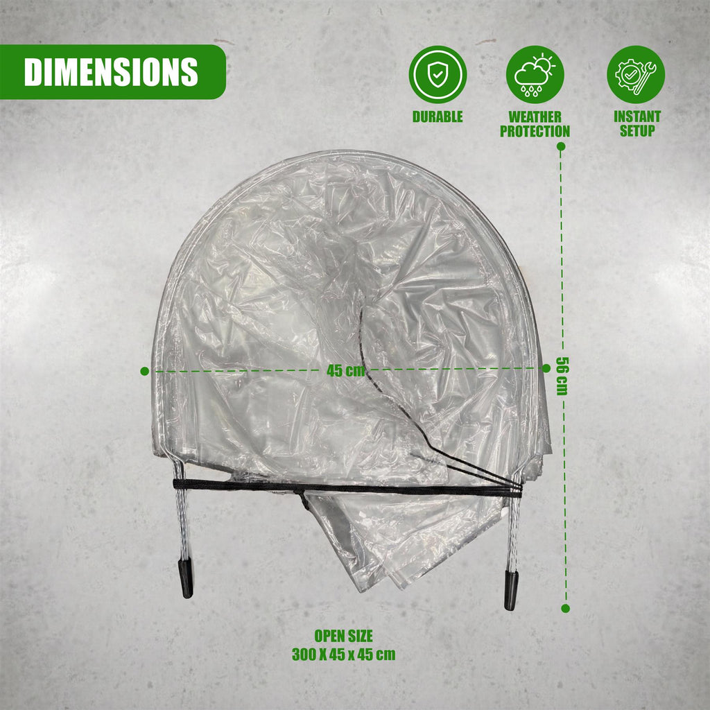 - SPECIFICATIONS: Item Dimensions: Width: 300 cm, Depth: 45 cm, Height: 45 cm / Weight: 600 g / Package Dimensions: Height: 3 cm, Width: 56 cm, Depth: 45 cm / Package Weight: 630 g / Material: Polyethylene / Color: Clear / Set Includes: 1x Grow Tunnel, 6x Stakes