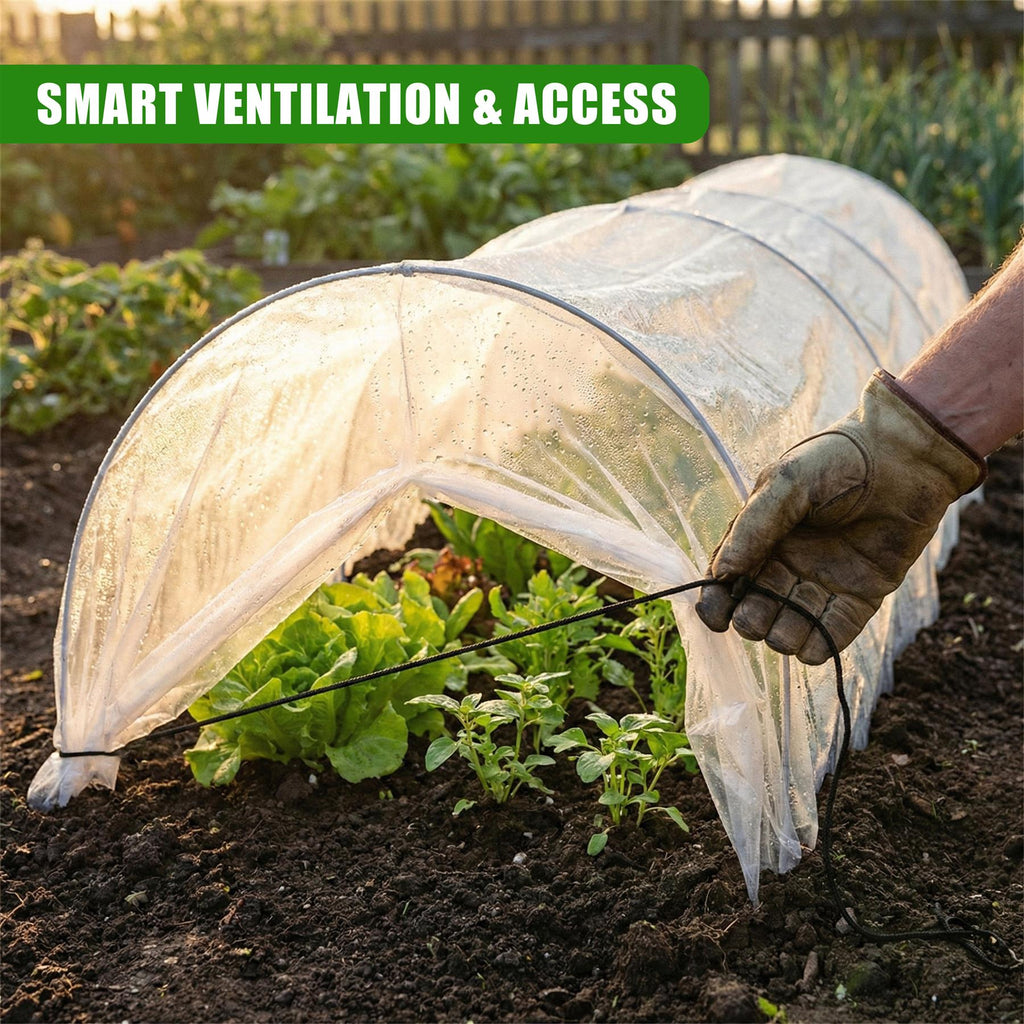 Designed with a convenient adjustable end closure system. Simply open the ends to allow fresh air to circulate on hot days, or to easily access your plants for watering and weeding without removing the entire tunnel.