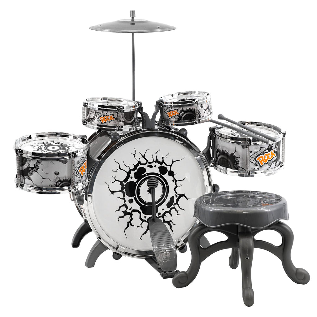 Let your child take the stage with this Kids Rock Drum Kit. Featuring a bold black and white "Rock" design, this junior set is built for fun. It comes with everything needed to start playing, including drums, cymbal, a foot pedal, and a stool. Easy to assemble, this beginner drum kit is great for building coordination and confidence. It is the perfect musical toy for boys and girls ready to rock out.