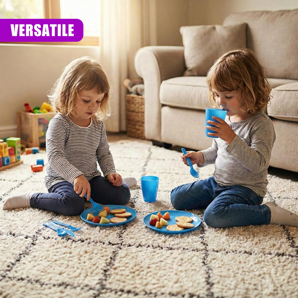 Lightweight and robust, this picnic dinner set is ideal for camping trips, caravans, BBQs, and garden parties. It is also excellent as a safe kids plastic plates set for everyday home use.