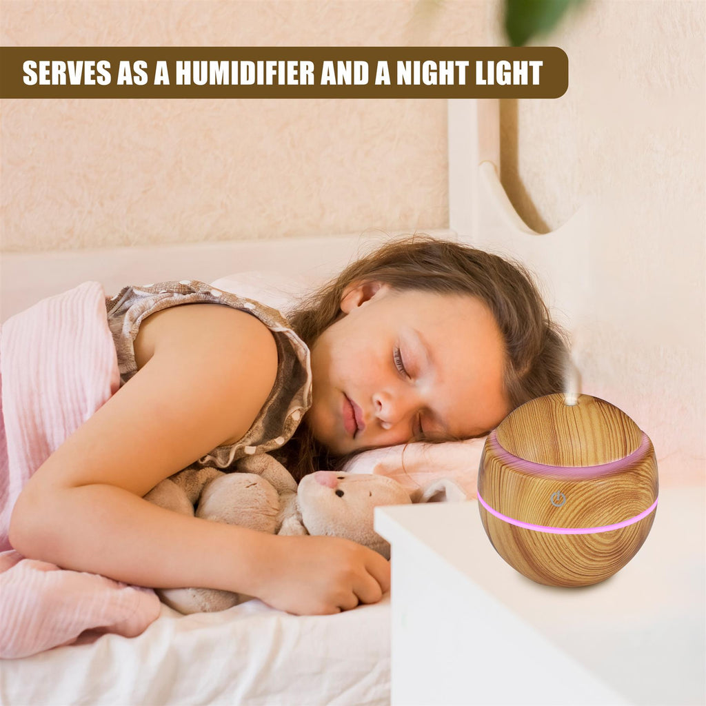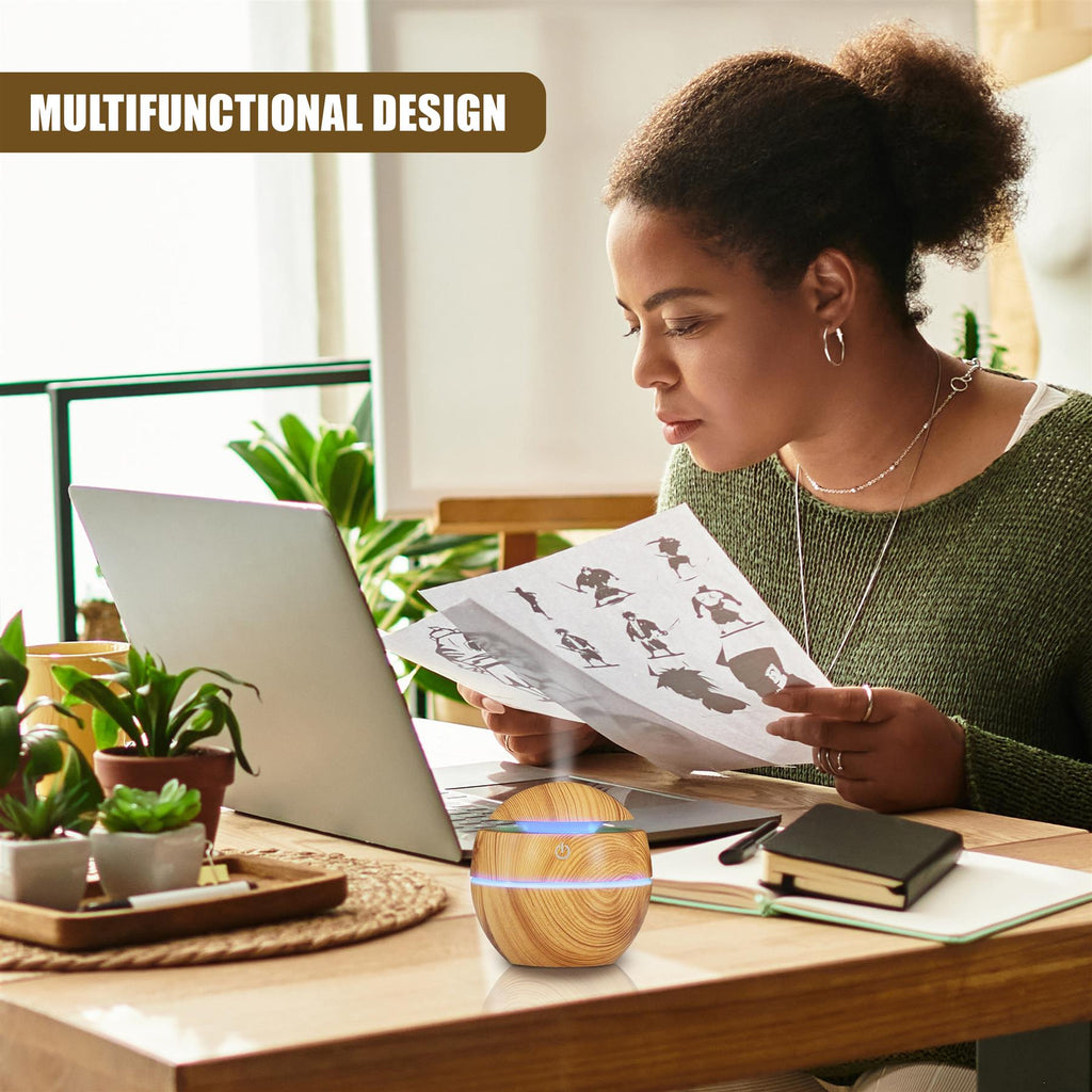This mini humidifier for bedroom or home also works as a desk humidifier diffuser. Portable USB air humidifier with 130ml capacity, wooden grain design, and colour changing LED moisturises skin, improves air quality, and supports calming aroma therapy.