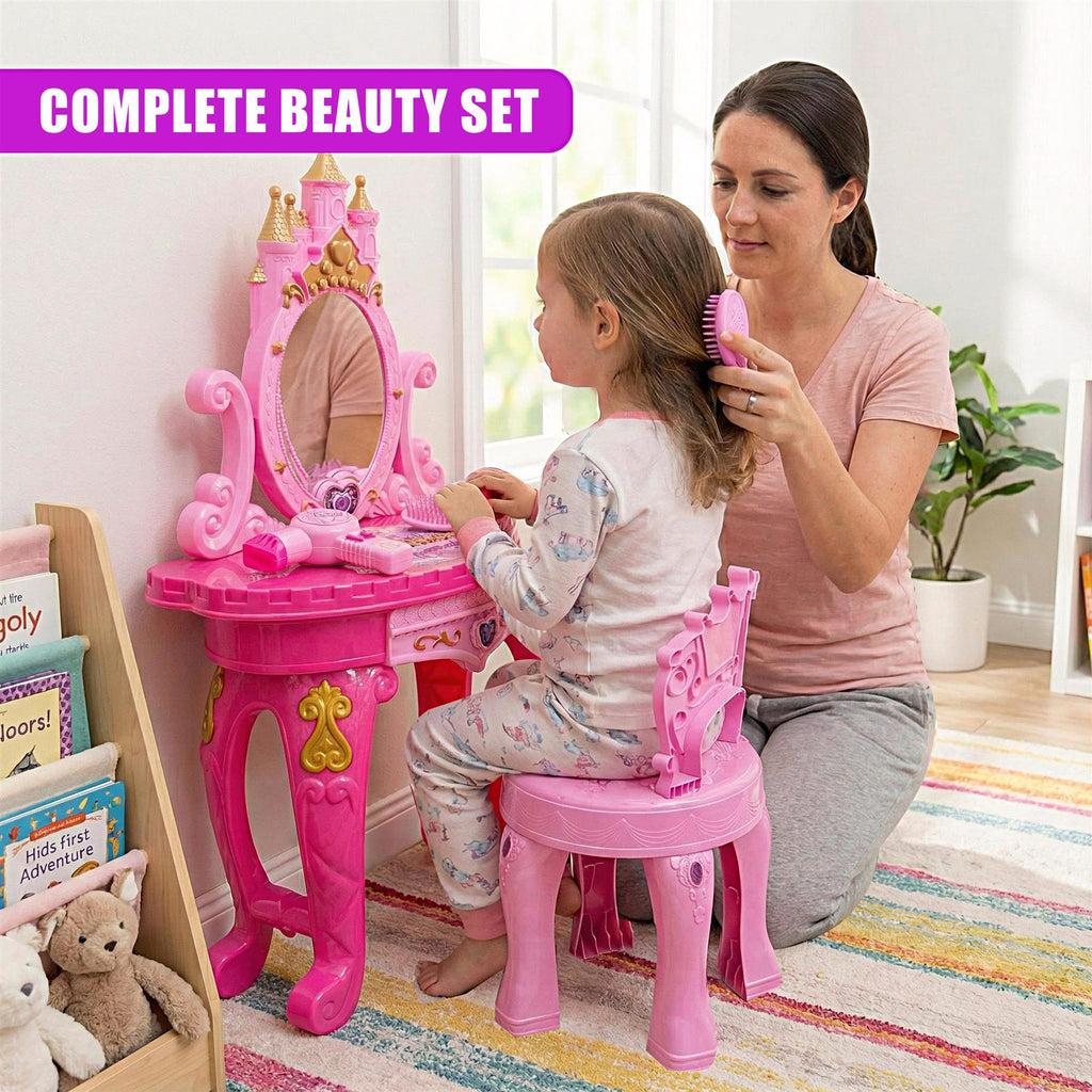 Make your little one feel like royalty with our Princess Vanity Table and Stool. This enchanting kids makeup table is designed with a magical pink castle motif, perfect for any bedroom or playroom. It comes fully equipped with essential styling tools, including a toy hairdryer, brush, and plastic scissors, allowing children to practice their hairdressing skills safely. With a matching stool and play jewellery included, it offers hours of creative, screen-free fun for aspiring little stylists.