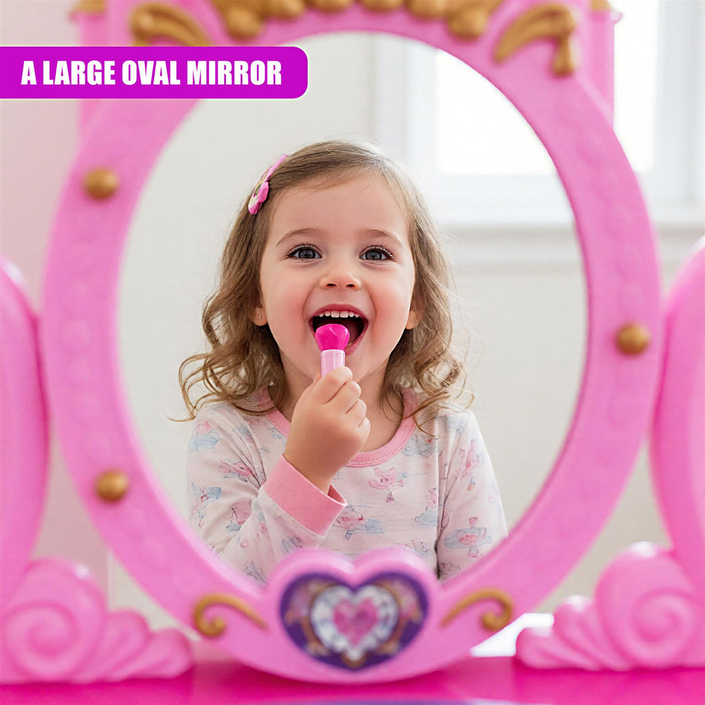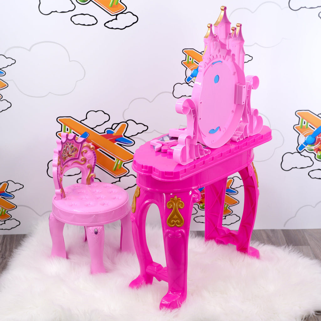 This kids vanity table features a pink castle-themed frame with turret details and a large oval mirror. Includes a matching sturdy stool for comfortable seating.