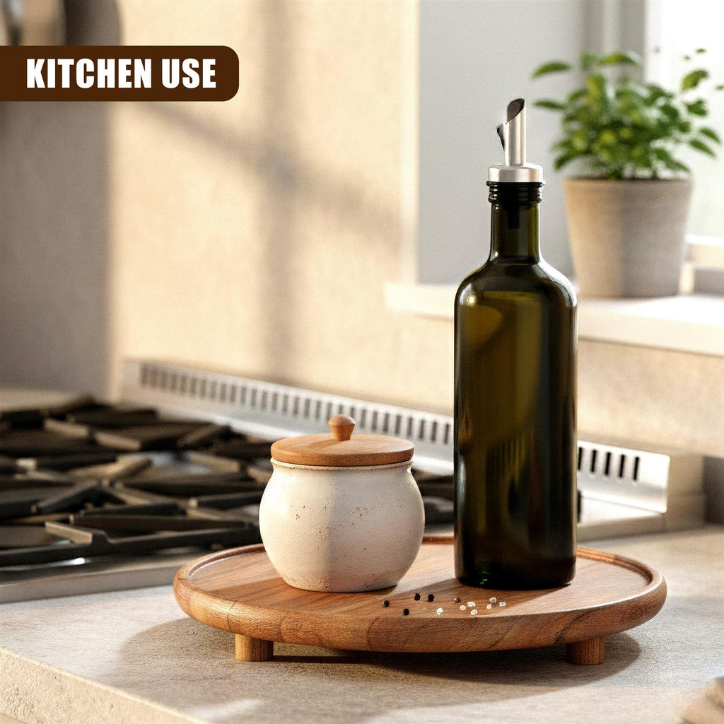 Elevated wooden round tray with subtle feet for better stability and easy lifting. Keeps surfaces dry and protected while creating a refined display for food, candles, or centrepieces.