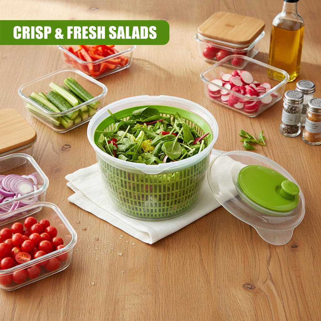Prepare fresh and crunchy salads in no time with our Salad Spinner. This essential kitchen tool takes the hassle out of washing greens, using a simple spinning mechanism to dry your vegetables quickly and effectively. The unit features a removable inner basket that acts as a colander for rinsing, and a clear outer bowl that can be used for serving. Designed with user-friendly locking clips and a smooth rotary handle, this salad dryer ensures your ingredients are perfectly prepped for dressings every time.