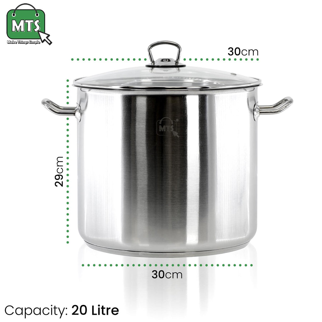 - SPECIFICATIONS: Item Dimensions: Width: 30 cm, Depth: 30 cm, Height: 29 cm / Weight: 3800 g / Package Dimensions: Height: 33 cm, Width: 35.5 cm, Depth: 36 cm / Package Weight: 3850 g / Material: Stainless Steel / Color: Silver / Capacity: 20 Ltr, Dimensions: Height With Lid: 36cm (Approx), Diameter: 30cm, Diameter with Handles: 41.5cm (Approx) / Hob Compatibility: Gas, Induction, Electric, Ceramic, Halogen, Dishwasher Safe / Note: Avoid boiling dry to prevent damage to the base.