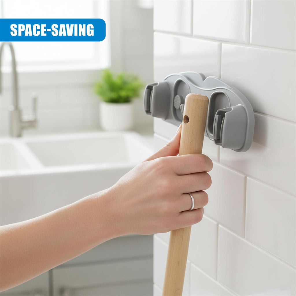 Designed to hold up to 3 items at once, 2 broom or mop handles in the slots and 1 hanging tool on the hook. Keep cleaning essentials accessible, off the floor, and neatly organised with this versatile brush holder for wall mounting.