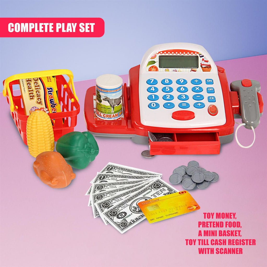Comes with toy money, pretend food, and a mini basket. This toy till cash register with scanner has all the essentials for interactive learning and play.